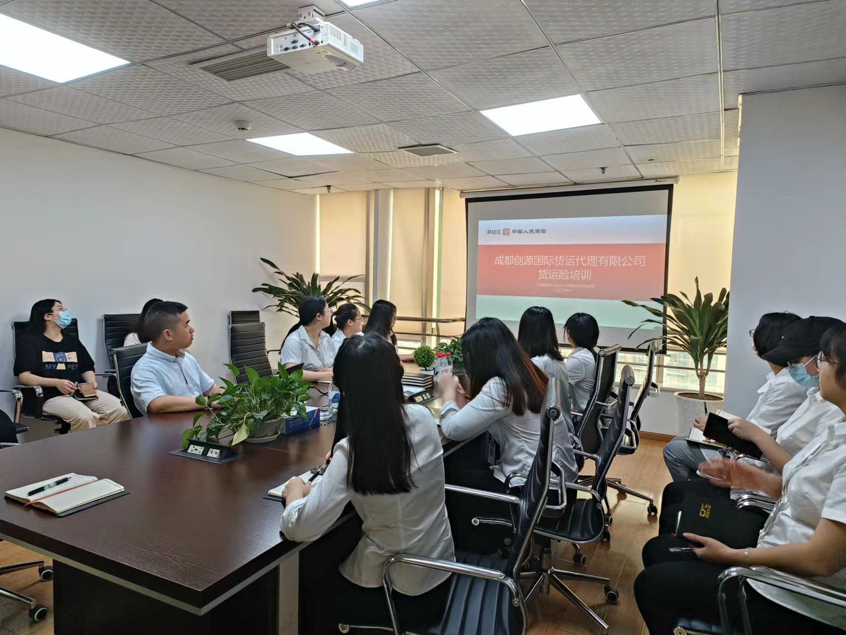 2022年8月26日上午, 人保四川分公司国际部黄河、谭明辅受邀来到创源货运公司,为创源操作团队进行货物运输保险承保事务培训,针对创源公司在运输投保过程中遇到的问题现场答疑。本次培训由人保四川分公司国际部谭明辅主讲,现场分析公司在运输过程中出现过的保险理赔案例,详细解说常规投保的规范性与预投保的重要性,货运风险、防范措施、纠正投保概念、讲解货运险理赔程序所需资料等专业知识,分享海事\汽运出险理赔案例,提高操作过程中的风险防范与管控意识。